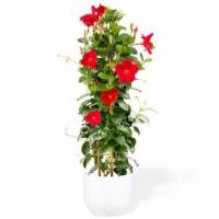Le dipladénia (ou mandevilla) est une plante grimpante qui habille les espaces verticaux de fleurs en forme de trompettes aux couleurs vives.