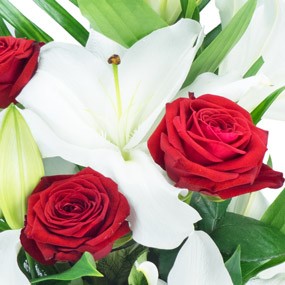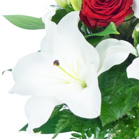 Détail du bouquet de fleurs : lys blancs, 3 roses rouges et feuille de kentia le tout uni par un lien harmonieux (réf. florale 0135, Mystère de roses) - Visuel non contractuel - Visuel correspondant à la formule Meilleur Compromis - Offre non valable pour la St Valentin