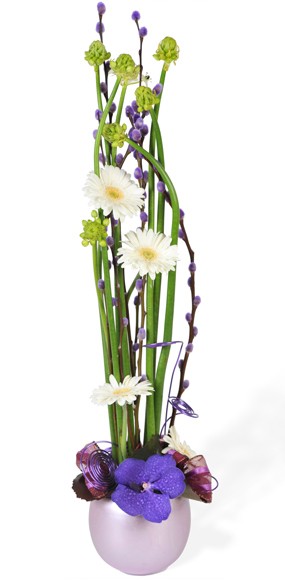 Détails du bouquet : contenant en céramique boule violine (blanc ou mauve ou rose selon la disponibilité en magasin), germinis blancs, orchidée vanda violette (ou autre variété d'orchidée dans la même tonalité), chatons, l'ornithogalum, arabicum, un ruban de couleur harmonieuse à la base et du fil bonzaï (Fleurs variables selon les saisons et la disponibilité en magasin tout en gardant l'esprit la forme et les couleurs)(Réf. Florale 2216, Diva) - Visuel non contractuel, visuel correspondant à la formule Meilleur Compromis