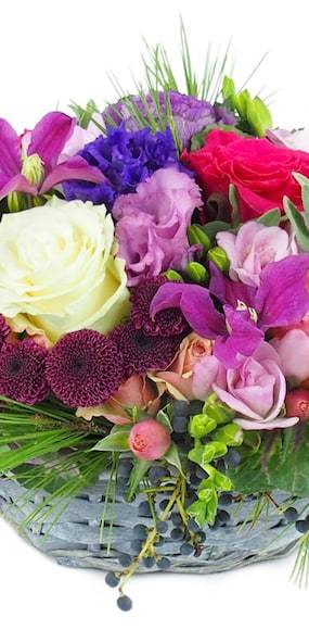 Détail de la composition: Assemblage de fleurs dans les dégradés de rose, blanc, mauve. Réalisé par un artisan fleuriste local il se compose de rose, santini, lisianthus, clématite, freesia, chou, baie et feuillage. Le tout piqué dans un panier rond. (Fleurs et contenant variables selon les saisons et la disponibilité en magasin tout en gardant l'esprit, la forme et les couleurs). (Ref Florale : 2322 - Orlando). Visuel non contractuel - Visuel correspondant à la formule Meilleur Compromis.
