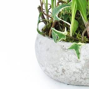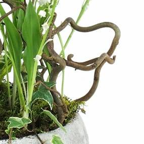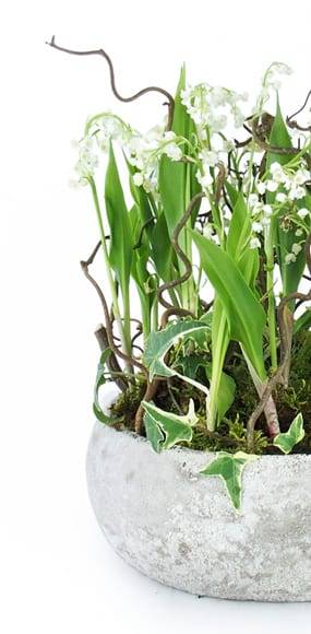 Détail de la composition : Envoyez du bonheur à vos proches, nous leur livrerons cette très jolie composition de griffes de muguet réalisée dans un contenant rond en béton brut, ou en céramique blanche ou grise (suivant disponibilité en magasin). Le muguet est agrémenté à la base de mousse des bois, accompagné d'un petit lierre et décoré de branchage tel que du tortuosa (branche de Corylus Noisetier...)(Réf florale : 3160 - Esprit Forêt)(Réf : 3160 - Esprit Forêt) - Produit non valable pour la Corse et les Dom Com - Visuel non contractuel